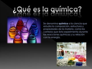 La química es la ciencia que estudia la composición, estructura y propiedades de la materia, así como los cambios que experimenta durante las reacciones químicas y su relación con la energía. La química cubre un amplio campo de estudios que se divide en seis ramas principales: química inorgánica, química orgánica, bioquímica, química física, química industrial y química analítica.