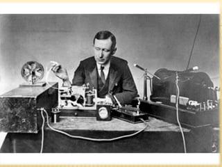 El documento resume el origen, función, beneficios, desventajas e influencias de la radio. Explica que mientras no existe un único inventor, figuras como Maxwell, Hertz, Tesla y Marconi contribuyeron al desarrollo de la tecnología de radio. La radio transmite audio a través de ondas y permite la interacción social, aunque también puede causar contaminación acústica y pérdida de comunicación directa.
