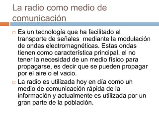 La radio ha evolucionado desde las primeras señales transmitidas en 1919 hasta convertirse en un medio masivo de comunicación. Transmite señales electromagnéticas sin necesidad de un medio físico, lo que permitió su rápida adopción. En los años 20 se asignaron las primeras frecuencias y se iniciaron las transmisiones comerciales. En Colombia, la radio también se desarrolló rápidamente y hoy en día existen varios tipos de emisoras clasificadas por su fuente de ingresos e ideología.