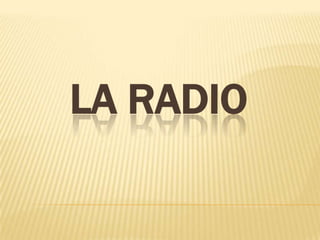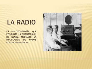 La radio es una tecnología que permite la transmisión de señales a través de ondas electromagnéticas. Su historia comienza en la segunda mitad del siglo XIX con los descubrimientos de Maxwell, Morse y Bell, y evoluciona con Marconi y las primeras transmisiones inalámbricas. En la actualidad, a pesar del surgimiento de otros medios como la televisión, la radio sigue siendo relevante gracias a su capacidad de estimular la imaginación y su bajo costo.