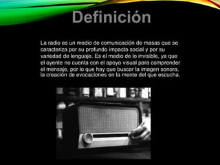 Este documento describe la historia y el propósito de la radio internacional. Resume que Guillermo Marconi inventó la radio en 1896 y logró la primera transmisión internacional entre Inglaterra y Francia en 1899. Explica que la radiodifusión internacional se dirige a audiencias extranjeras con fines ideológicos, de preservación de lazos o promoción cultural. Las primeras emisoras internacionales incluyeron la BBC y Radio Vaticano en los años 1920 y 1930.