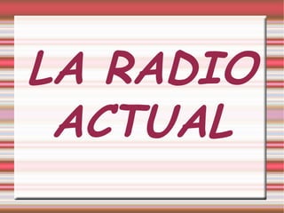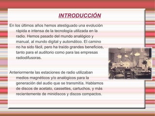 El documento describe la evolución de la radio desde tecnología analógica hasta digital, destacando cómo los avances han facilitado la operatividad y el alcance de las emisoras. Se explican los componentes y funcionamiento de la radio, así como las diferencias actuales entre emisoras y los estándares de transmisión digital como DAB, IBOC y DRM. Además, se menciona la importancia de la digitalización en la mejora de la calidad del sonido y la eficiencia en el uso del espectro radiofónico.
