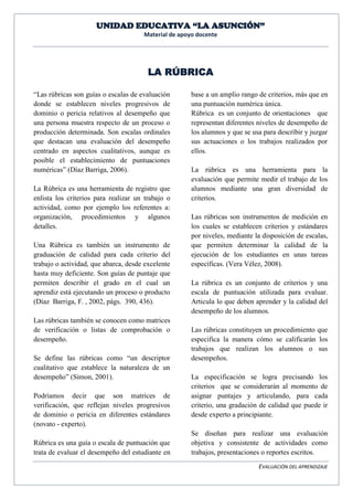 El documento describe las rúbricas como instrumentos de evaluación que establecen criterios y estándares por niveles para determinar la calidad del desempeño de los estudiantes. Las rúbricas definen los aspectos a evaluar de una tarea y las escalas de valoración para cada criterio, desde un nivel deficiente hasta excelente. Permiten realizar una evaluación objetiva del aprendizaje de los estudiantes.