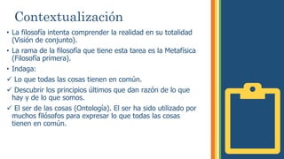 La filosofía, especialmente la metafísica, intenta comprender la realidad en su totalidad. La metafísica indaga lo que todas las cosas tienen en común, los principios últimos que dan razón de lo que existe y de lo que somos. Aunque a veces llamamos real a lo que percibimos con los sentidos, no todo lo que percibimos es necesariamente real, y la realidad no depende de nuestra mente. La realidad psíquica se refiere a nuestros pensamientos y emociones internos, mientras que la realidad virtual genera percepciones a