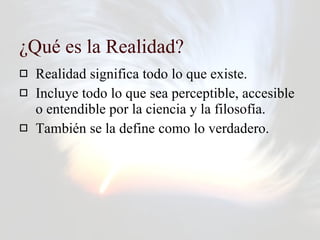 La realidad incluye todo lo que existe y es perceptible por la ciencia y la filosofía. A través de la historia, diferentes culturas han explicado la realidad a través de creencias religiosas, mitológicas y científicas. Existen varios tipos de realidad como la fenomenológica, general, virtual y de construcciones mentales; y la realidad absoluta que es independiente de la percepción humana. La ciencia intenta explicar la compleja realidad absoluta a través de teorías, experimentos y modelos, dejando de lado los
