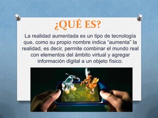 Este documento describe la realidad aumentada, que permite combinar el mundo real con elementos virtuales agregando información digital a objetos físicos. Se necesita un dispositivo con pantalla y cámara como un smartphone o tableta, e instalar un software de realidad aumentada con activadores como códigos QR. La realidad aumentada puede utilizarse en educación para que los estudiantes exploren el mundo de una nueva perspectiva y mejore la motivación y el aprendizaje.