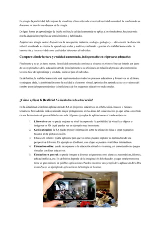 La Realidad Aumentada combina elementos virtuales con el entorno físico real para crear una realidad mixta, incorporando información virtual a través de dispositivos como cámaras, pantallas y software a la información física existente. Se utiliza en aplicaciones como educación, medicina, industria y más, mejorando los aprendizajes y activando áreas cerebrales. La Realidad Aumentada se implementará en todos los procesos educativos debido a su eficiencia para mejorar la comprensión lectora y optimizar los aprendizajes.