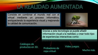 El documento describe el potencial de la realidad aumentada en la educación. Menciona que la realidad aumentada permite mejorar la interactividad de los libros de texto y visualizar objetos en 3D desde diferentes ángulos, así como conocer información sobre ubicaciones físicas. También puede usarse para que los estudiantes exploren su entorno de una nueva manera y mejorar la motivación. La realidad aumentada apoyada por aplicaciones como LearnAR puede usarse en diversas áreas como matemáticas, ciencias y educación física para proporcionar experiencias de apre
