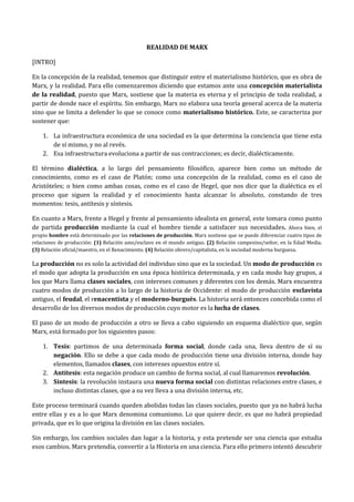 Marx propuso el materialismo histórico, el cual sostiene que la infraestructura económica determina la conciencia social y evoluciona dialécticamente a través de contradicciones. Marx identificó cuatro modos de producción históricos (esclavista, feudal, capitalista moderno) impulsados por la lucha de clases. El materialismo dialéctico de Engels explica la materia como dinámica y cambiante bajo tres leyes. Mientras el materialismo histórico explica los cambios sociales, el material