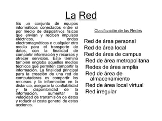 El documento proporciona una introducción a las redes de computadoras, incluyendo definiciones de redes, clasificaciones de redes, tipos de redes como LAN y WAN, topologías de red, componentes de red como tarjetas de interfaz y módems, y tecnologías de red como Ethernet y Token Ring.