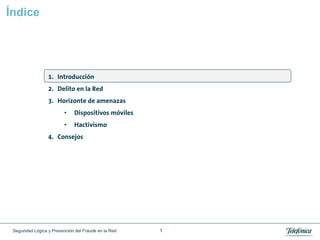 El documento aborda la seguridad lógica y la prevención del fraude en la red, analizando la ciber delincuencia y sus horizontes de amenazas, incluyendo la ciberdelincuencia y el hacktivismo. También se ofrecen consejos prácticos para protegerse, como la importancia de los certificados digitales y mantener la privacidad en redes sociales. Se destaca la necesidad de estar alertas ante nuevas formas de delitos en el ciberespacio y de adoptar medidas proactivas de seguridad.
