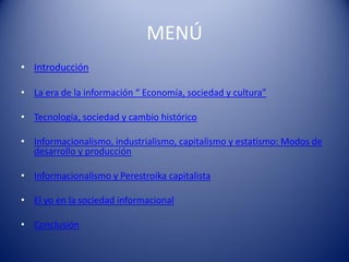 El documento discute cómo la sociedad actual está dominada por la información y la tecnología. Explica que la era de la información ha transformado la economía, la sociedad y la cultura a nivel global e introduce nuevos modos de desarrollo y producción como el informacionalismo. También analiza cómo la tecnología está cambiando la naturaleza del yo en la sociedad informacional.
