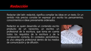 El documento define la redacción como la expresión escrita de ideas y conocimientos previamente organizados. Explica que un redactor es un escritor profesional que toma en cuenta los requisitos de la escritura correcta. Además, destaca la importancia de la redacción para expresarse de forma clara a través de medios escritos como redes sociales o blogs.