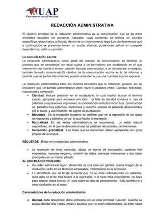 El documento trata sobre la redacción administrativa. Su objetivo principal es la comunicación entre entidades estatales y personas sobre asuntos legales relacionados al trabajo. La comunicación escrita administrativa se caracteriza por seguir un formato establecido y tiene como objetivo informar e intercambiar ideas entre un emisor y receptor. Una redacción administrativa efectiva se distingue por su claridad, brevedad, naturalidad y corrección gramatical.