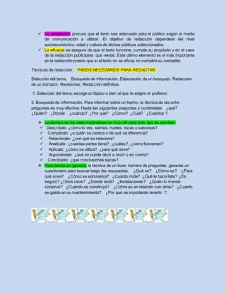 El documento define la redacción como el proceso de dar forma escrita a un tema dado, a diferencia de la composición que implica crear elementos originales. Explica que la redacción se utiliza para escribir cartas, notas e informes, y tiene tres fundamentos: corrección, adaptación y eficacia. También describe varias técnicas para redactar como la selección del tema, búsqueda de información, elaboración de un bosquejo y revisiones.