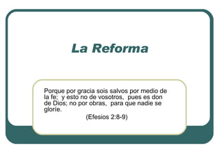 Los cinco lemas clave de la Reforma Protestante son: Sola Scriptura (solo la Escritura como autoridad), Sola Fide (solo la fe como medio de salvación), Sola Gratia (solo la gracia como fundamento de salvación), Sola Christus (solo Cristo como objeto de fe), y Soli Deo Gloria (solo a Dios la gloria en la adoración). Estos lemas resaltan las doctrinas centrales de la autoridad de la Biblia, la justificación por la fe, la gracia de Dios, la suficiencia de Cristo y la gloria de