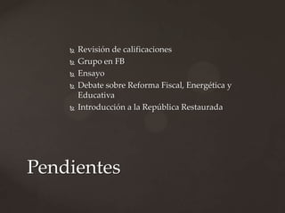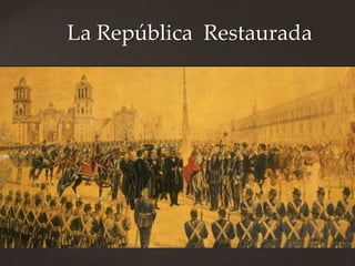 El documento proporciona información sobre la vida y carrera política de Porfirio Díaz. Comenzó su carrera apoyando a los liberales y a Benito Juárez, llegando a ser gobernador de Oaxaca. Después se volvió en contra del gobierno de Lerdo de Tejada y lanzó la Revolución de la Noria en 1871 y el Plan de Tuxtepec en 1876 para derrocar a Lerdo, logrando finalmente convertirse en presidente de México en 1877.