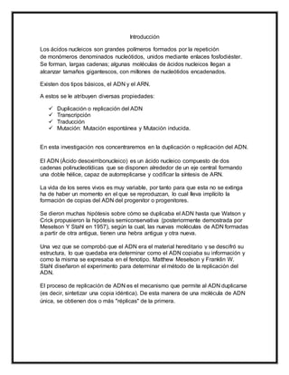 Este documento describe el proceso de replicación del ADN. Explica que la replicación es semiconservadora, lo que significa que cada nueva molécula de ADN contiene una cadena original y otra nueva. Detalla las fases e involucra a enzimas como la ADN polimerasa y helicasa. El objetivo es aprender sobre este proceso fundamental por el cual el ADN se duplica para permitir la división celular.