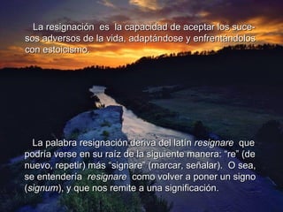 La resignación se refiere a la capacidad de aceptar los sucesos adversos de la vida con estoicismo, darles un nuevo significado y seguir adelante sin oponer resistencia inútil a lo inevitable. No es conformarse o sentirse vencido, sino aprender a perder lo que ya no forma parte de la vida y retomar otra lucha diferente. La resignación ayuda a aliviar la carga de las contingencias de la vida y es una cualidad de las personas humildes y pacientes que les permite adaptarse sabiamente a los acontecimientos desfavorables.