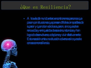 Este documento trata sobre la resiliencia. Define la resiliencia como la capacidad de las personas de sobreponerse a situaciones difíciles y salir fortalecidas de ellas. Explica que la resiliencia depende de factores internos como el control emocional y exteriores como el apoyo de las relaciones cercanas. También describe estrategias para fomentar la resiliencia en niños, adolescentes y adultos a través de la educación y un ambiente de apoyo.