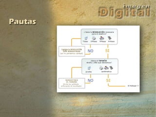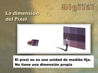 El documento explica que el píxel no tiene un tamaño fijo y que la resolución determina la densidad de píxeles de una imagen. Al cambiar la resolución, se modifica el tamaño y densidad de píxeles de dos formas: remuestreo, que afecta la calidad al modificar el número de píxeles, o redimensionado, que no cambia la cantidad de píxeles ni la calidad de la imagen.
