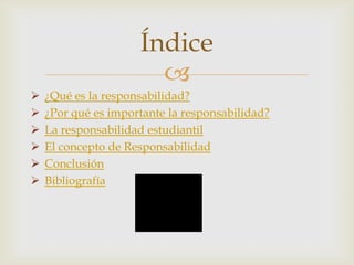 Este documento define la responsabilidad como asumir las consecuencias de nuestros actos intencionales, explica por qué es importante como capacidad para organizar la vida y tomar decisiones razonadas, y señala que la responsabilidad estudiantil también depende de los alumnos comprendiendo los cambios en la educación.