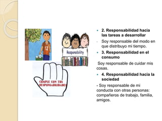 Este documento describe cuatro tipos de responsabilidad: 1) responsabilidad hacia uno mismo, que incluye ser responsable de tus deseos, elecciones, felicidad y valores; 2) responsabilidad hacia las tareas, como distribuir tu tiempo; 3) responsabilidad en el consumo, como cuidar tus cosas; y 4) responsabilidad hacia la sociedad, como tu conducta con otras personas.