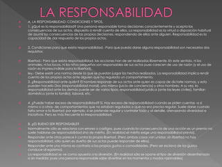 La responsabilidad requiere libertad y existencia de normas. Una persona es responsable cuando toma decisiones libremente y acepta las consecuencias de sus actos de acuerdo a las normas establecidas, pudiendo rendir cuentas ante Dios, ante sí misma o ante otros hombres, ya sea de forma moral, jurídica, familiar u otra. Aunque a veces se ve como algo negativo, ser responsable es positivo porque promueve la libertad al mismo tiempo que la rendición de cuentas y evita el egoísmo y la diversión sin medida.