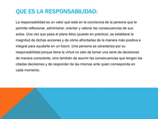 La responsabilidad es un valor que permite a las personas reflexionar y asumir las consecuencias de sus actos, clasificándose en diversas formas como social, laboral, en el hogar, educativa, ciudadana y parental. Cada tipo de responsabilidad implica un compromiso y una respuesta ante las decisiones tomadas, siendo esencial para el desarrollo individual y social. La educación en responsabilidad se inicia en la infancia y es un aspecto compartido entre individuos, familias y la sociedad en general.