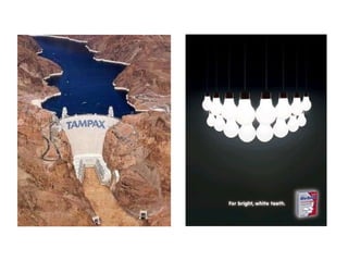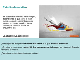 El documento describe diferentes herramientas y técnicas del lenguaje visual utilizadas en publicidad, incluyendo el estudio denotativo y connotativo de imágenes, el uso de elementos como el tamaño, la forma, el color, y técnicas retóricas como la personificación, animalización, comparación, metáfora, metonimia, antítesis, paralelismo, elipsis, hipérbole y acento. Explica cómo estas herramientas buscan transmitir mensajes e influir en la audiencia de manera efectiva.