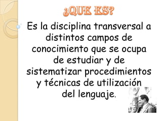 La retórica es la disciplina que estudia el uso efectivo del lenguaje. Surge en la antigua Grecia y está vinculada a lo judicial y político más que a lo literario. Tiene como objetivo lograr la persuasión del público a través de técnicas como la invención, organización y ornamentación del discurso.