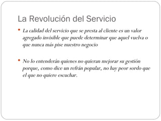 El documento habla sobre la importancia de la calidad del servicio al cliente y la necesidad de transformar la cultura de las empresas hacia una mayor dedicación al cliente. Menciona las cinco categorías de dedicación a la calidad del servicio, los siete pecados más comunes del servicio, y la necesidad de que las empresas salgan de prácticas convencionales para enfocarse más en la satisfacción continua del cliente.