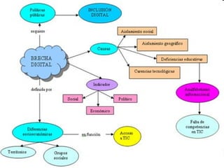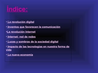 Este documento describe el impacto de la revolución digital y la evolución de Internet. Explica cómo las tecnologías digitales y la Internet han transformado la comunicación y la sociedad, creando oportunidades pero también desafíos relacionados con la brecha digital, la privacidad y la ciberdelincuencia. También describe el surgimiento de la Web 2.0 y cómo ha empoderado a los usuarios para crear y compartir contenido en línea de manera social.