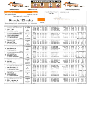 El documento detalla las carreras de caballos, incluyendo información sobre cada ejemplar, sus entrenadores, pesos, premios y resultados en distintas competencias. Se menciona que las carreras son para yeguas de diferentes edades y las distancias varían entre 1100 y 1300 metros. También se incluyen datos sobre las instalaciones y los mencionados cambios de implementos.