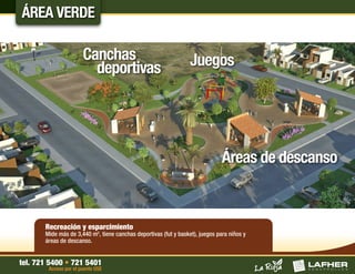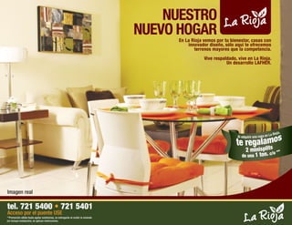 El documento promueve un nuevo desarrollo residencial llamado La Rioja, ofreciendo casas con diseños innovadores en terrenos más grandes. La Rioja cuenta con 5 modelos de casas de 1 o 2 plantas entre 58-124 metros cuadrados, con fachadas vanguardistas y amplios espacios. Además, tiene un área verde con juegos, canchas deportivas y áreas de descanso. El fraccionamiento ofrece servicios eléctricos subterráneos y pavimento de concreto.