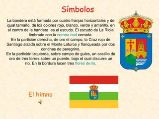 La Rioja es una comunidad autónoma del norte de España con 322.415 habitantes. Limita con el País Vasco, Navarra, Aragón y Castilla y León. Su bandera tiene cuatro franjas horizontales de color rojo, blanco, verde y amarillo con el escudo de La Rioja en el centro. El escudo muestra la cruz de Santiago, un castillo sobre un puente y un río, y tres flores de lis. La capital y ciudad más grande es Logroño. La gastronomía se caracteriza por platos con cordero y verduras como las pat