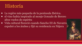 Este documento describe la región de La Rioja en España y su historia de producción de vino. La Rioja es la región vinícola más pequeña de España y es conocida por sus vinos tintos de alta calidad. El documento explica el proceso de vinificación, el envejecimiento del vino, las catas y calificaciones, y destaca a La Rioja como la única región con Denominación de Origen Calificada en España.