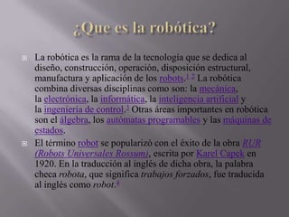 Este documento habla sobre la clasificación de los robots. Explica que existen 5 tipos principales de robots: 1) poliarticulados, 2) móviles, 3) androides, 4) zoomórficos, y 5) híbridos. Cada tipo se caracteriza por su estructura, capacidad de movimiento, y funcionalidad.
