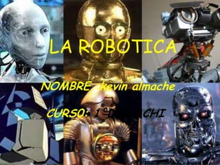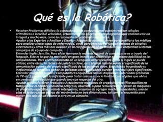 Este documento trata sobre la robótica. Explica que la robótica involucra el uso de robots para resolver problemas complejos, ayudar a expertos en análisis y diseño, entender lenguajes e imágenes simples, y ayudar en la manufactura. También discute brevemente la historia de la robótica, las tres leyes de la robótica propuestas por Isaac Asimov, y los factores clave en el desarrollo de los primeros robots en la década de 1950.