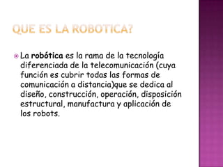 La robótica se dedica al diseño, construcción y aplicación de robots. Los robots se dividen en poliarticulados, móviles, androides, zoomórficos y híbridos. Los androides intentan reproducir la forma y comportamiento humano aunque actualmente tienen poca utilidad práctica. La historia de la robótica está ligada a la construcción de artefactos que imitan seres vivos y descargan el trabajo humano, con el término "automática" acuñado por el ingeniero español Torres Quevedo. Existen cuatro gener
