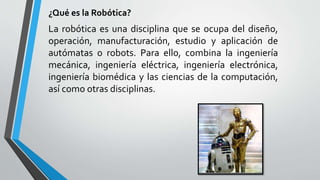 La robótica es una disciplina que combina varias ingenierías y ciencias para diseñar, operar y aplicar robots. Los robots tienen como objetivo realizar tareas de manera más eficiente que los humanos o en condiciones peligrosas. Aunque los robots pueden reemplazar trabajos humanos, también pueden usarse para explorar el espacio y ambientes extremos.