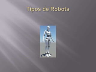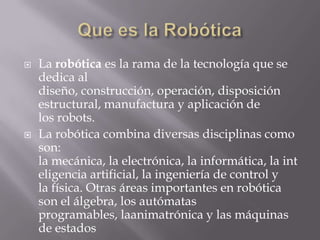 La robótica se dedica al diseño y aplicación de robots. Combina disciplinas como mecánica, electrónica e inteligencia artificial. Los robots industriales son útiles para tareas como soldadura y pintura. Están compuestos de eslabones rígidos unidos por articulaciones que permiten el movimiento. Existen varios tipos de robots clasificados por su estructura, función o generación tecnológica.