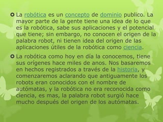 La robótica tiene sus orígenes hace miles de años cuando los primeros autómatas fueron creados para realizar tareas. Aunque la palabra "robot" surgió mucho después, la robótica como ciencia busca materializar el deseo humano de crear seres artificiales capaces de realizar trabajo. El ingeniero español Leonardo Torres Quevedo fue pionero en el desarrollo de dispositivos automatizados y acuñó el término "automática" para referirse a la teoría de automatizar tareas tradicionalmente asociadas a los humanos.