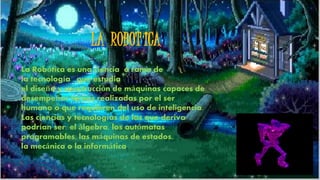 La robótica es una ciencia que estudia el diseño y construcción de máquinas capaces de realizar tareas humanas o que requieren inteligencia. Deriva de ciencias como el álgebra, la informática y la mecánica. Desde sus inicios, la robótica ha buscado crear artefactos que puedan realizar tareas pesadas o desagradables para los humanos. La evolución de la robótica a través de la inteligencia artificial ha permitido resolver problemas complejos y revolucionar la tecnología aplicada. Los robots permiten a los humanos dedicarse