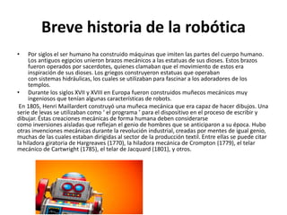 El documento habla sobre la historia y aplicaciones de la robótica. Brevemente describe los orígenes de la robótica a través de la historia y cómo ha evolucionado hacia la automatización industrial moderna. Explica las clasificaciones y aplicaciones comunes de los robots, incluyendo la transferencia de materiales, carga y descarga de maquinaria.