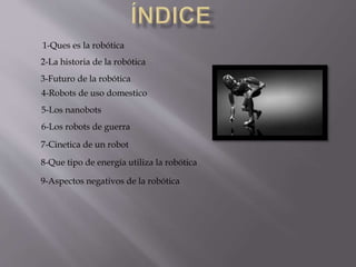 El documento trata sobre la robótica. Explica que la robótica combina disciplinas como la mecánica, electrónica e inteligencia artificial para diseñar y aplicar robots. También discute brevemente la historia de la robótica y cómo ha evolucionado a través de los años, desde máquinas simples hasta robots avanzados. Finalmente, analiza algunos usos actuales y futuros de los robots, así como posibles aspectos negativos como la pérdida de empleos humanos.