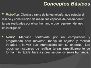 El documento describe los conceptos básicos de la robótica, incluyendo la definición de robot y manipulador. Explica los diferentes tipos de robots como terrestres, aéreos, acuáticos y androides. También resume brevemente la historia de la robótica y sus aplicaciones en entretenimiento, industria, medicina y otros campos.