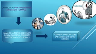 La robótica es una rama de la tecnología que se dedica al diseño, operación y disposición de los robots con capacidades similares a un ser humano, permitiéndoles trabajar de manera similar a un hombre.