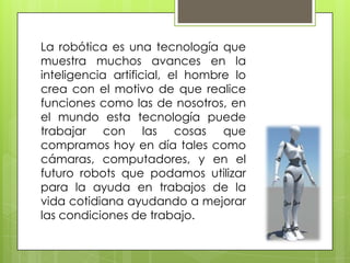 La robótica industrial contribuye al mejoramiento de la vida a través de tres formas principales: los robots pueden realizar funciones de manera continua sin necesidad de descanso, ayudando a mejorar las condiciones de trabajo; los robots pueden realizar algunas tareas más rápido y de manera segura que los humanos, lo que reduce los riesgos a la salud; y los robots se usan ampliamente en trabajos sucios, de alto riesgo o que requieren precisión, aumentando la producción de bienes.