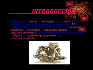Este documento trata sobre la robótica. La robótica combina disciplinas como la mecánica, electrónica, informática, inteligencia artificial e ingeniería de control para diseñar, fabricar y aplicar robots. Otras áreas importantes son el álgebra, autómatas programables y máquinas de estados. La historia de la robótica ha estado unida a la creación de artefactos que imitan seres humanos para aliviar el trabajo. El ingeniero Leonardo Torres Quevedo acuñó el término "automática". La cibernética estud
